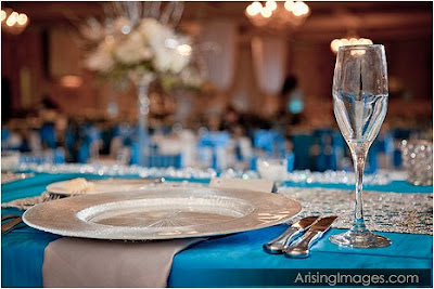 (photo credit - glittery linens; glittery charger; glitter runner; glitter flutes; glitter votives)