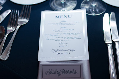 Menu Card: Adds another design element to the tablescape and let's the wedding guest know the food courses.